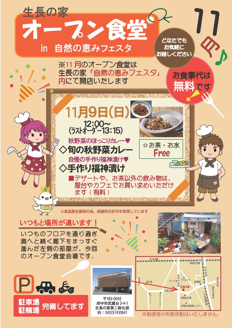 11月のオープン食堂は9日。自然の恵みフェスタ2025内にて、いつもより早い11:00から開店します。