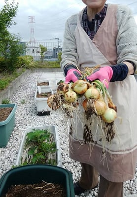 玉ねぎを収穫して、子ども食堂や練成会で使っていただいています。