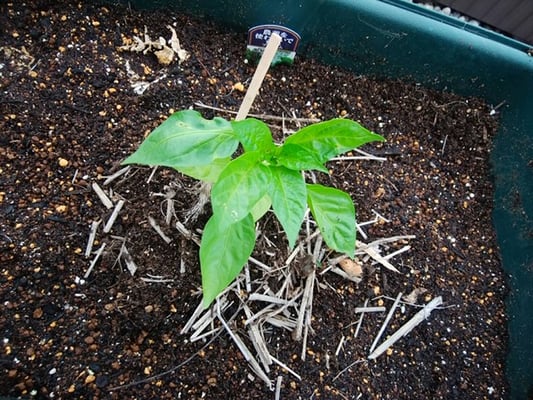 ミニトマト、ピーマンの苗を植え付けました。大雨にも負けず元気に育っています。