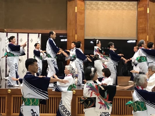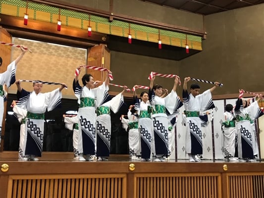 18日夜には、盆踊りの奉納をさせていただきました。1曲目は32名が二重の輪になって「帯の長宿」を優雅に踊り、2曲目は東京第一教区の皆様と交ざり、威勢の良い盆太鼓と共に「東京音頭」を総勢60数名で楽しく賑やかに踊ることができました。アハハオホホと笑い、先祖供養祭に花を添えることができました。