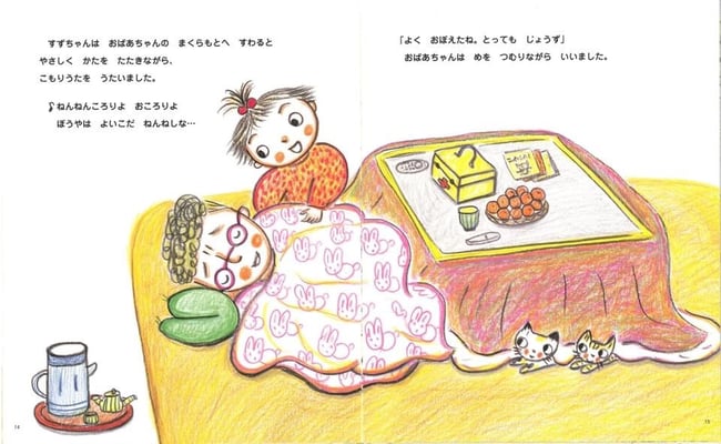 《すずちゃんはおばあちゃんが大好き、でも今日のおばあちゃんは調子が良くなくてこたつで横になってしまいました。すずちゃんはお薬の箱を持って来たり、毛布をかけてあげたり、子守唄を歌ったり、おでこを冷やしたりと一所懸命看病をします。そして、すずちゃんの温かい看病でおばあちゃんは元気になります》