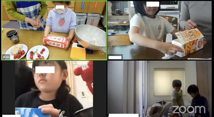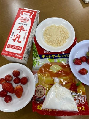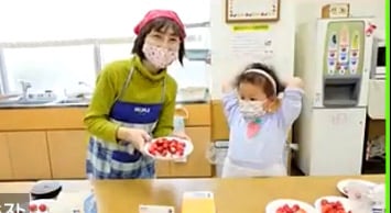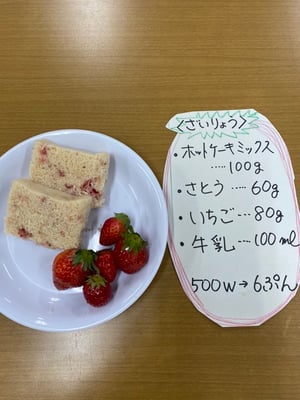 イチゴのヘタをとり、潰したり、砂糖、粉、牛乳を混ぜて、牛乳パックの容器に上手に入れて、電子レンジ500Wで6分、のんちゃんがほぼ一人で作りましたよ!画面越しのお友達も楽しく作っていました。