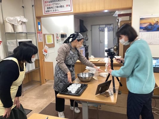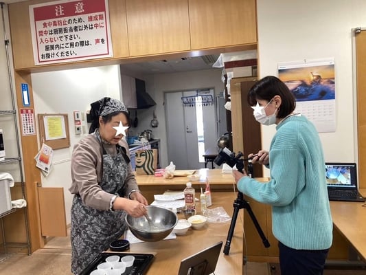 その他にりんごが用意できない場合の応用編や余った米粉の料理での使い道(シチューのとろみづけ等)の説明もいただきました。参加者毎に若干時間差はありましたが、だいたい丁度動画の視聴が終わった頃に、外はさっくり中はもちもちの優しい甘さのカップケーキが美味しく焼き上がりました。