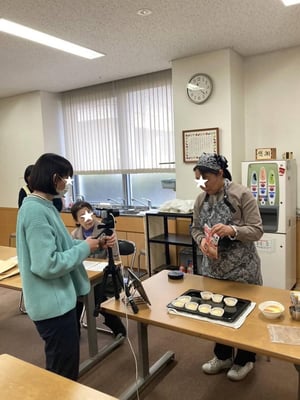 材料を混ぜて作った生地を紙カップに流し込み、オーブンで焼いている間に、本部講師天地忠衛先生の動画「夫妻調和之路~超越跨國婚姻的阻礙~夫婦調和の道~国際結婚の壁を越えて~」を視聴しました。視聴が終わり焼き上がりの時間が近づいて来ると、司会のA副会長が参加者へ声をかけながら焼き上がりの状態を確認し、参加者からも焼き具合について質問がありました。