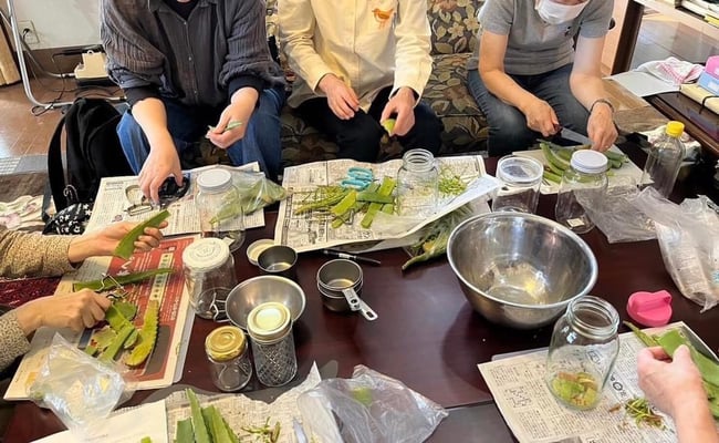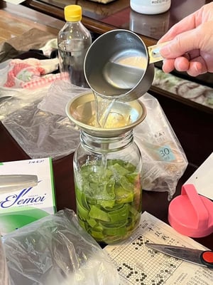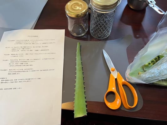 白鳩会 · 2024/06/11 【5/2にミニイベント~アロエ化粧水作り~をしました】 アロエを長年大事に育ている方に提供していただきました。アロエはいろいろな薬効があって、ちょっとした火傷・虫さされ・かゆみなどにつけると良いそうです。 刻んだアロエにホワイトリカー450ml、グリセリン50mlを加えて作りました。会場を貸してくださったお宅のお庭ではちょうどタラの芽が出ていて、摘んで天ぷらにしてご馳走してくださいました。 参加者からは「簡単に作れて使うのが楽しみです!タラの芽の天ぷらもおいしかった!」と感想をいただきました。 tagPlaceholderカテゴリ: shirohatokai, news コメントをお書きください コメント: 0