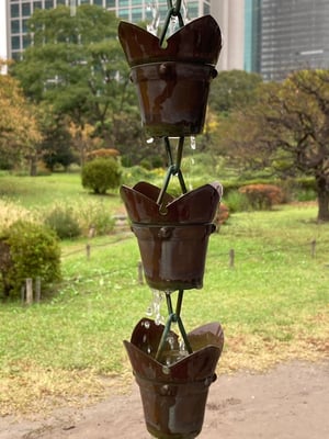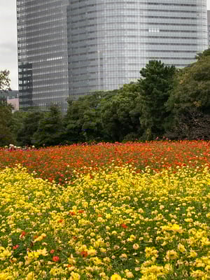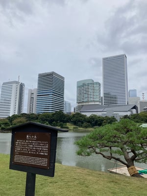 高いビルと調和して自然が豊かで広々とした庭園の池は潮入りとのことでボラが飛び跳ねていました。様々な植物達が秋の装いになり始め素晴らしい眺めでした。