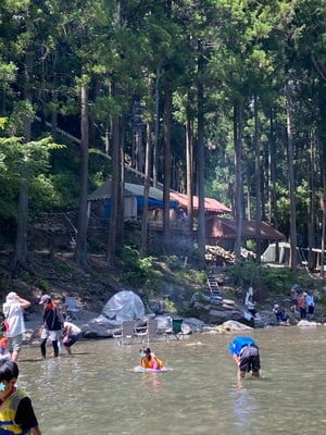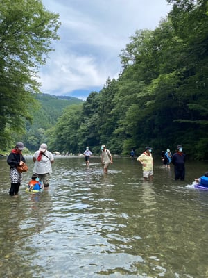 8時に教化部を出発し、道路も混むこと無く秋川渓谷に到着し、第一教区の皆様と現地で合流し川遊びが始まりました。水量は大人の膝くらいあり、水温も冷た過ぎず、気持ちの良い流れでした。