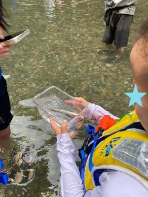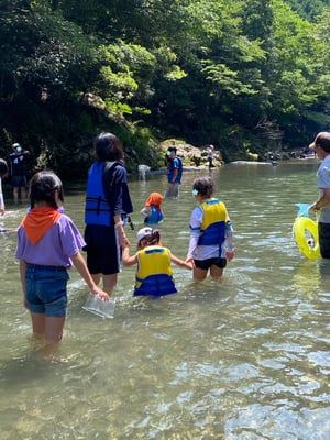 川辺には稚魚が群がり、夢中で網で上手に捕まえていました。その他鮎、サワガニ、カジカカエル、川エビ、やご、アオスジアゲハにも出会うことが出来、得意になって見せてくれました。