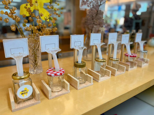 ●材料:ゴール枠の紙、木材、ジャムの空き瓶、針金、ネット(にんにく用)