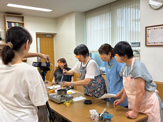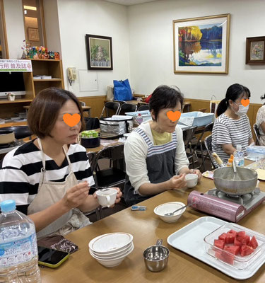 教化部信徒休憩室にて開催しました。今回は豆乳と桃を使ったジェラートと、季節のフルーツをアガーと寒天を原料とする凝固剤で固めたゼリーを、O副会長のご指導で作りました。