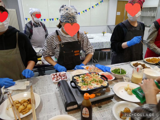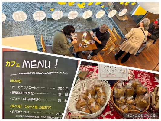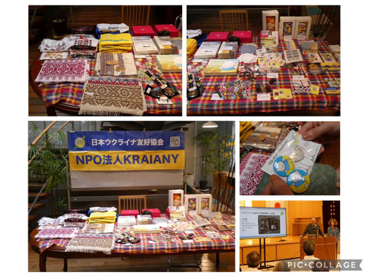 1階の外では有機野菜と手作りジャムの販売、中ではオープン食堂、カフェコーナー、たこ焼き屋台と、心のこもったおいしいものが勢ぞろい。中でもたこ焼きは3種類の味が楽しめました。また、ウクライナ支援の為のコーナーではウクライナの品々がところ狭しと並んでいました。