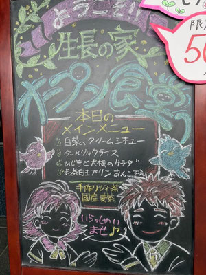 今月のメニューです。・白菜のクリームシチュー・大根とひじきのサラダ・抹茶ムース(白玉あんことさつまいも甘露煮添え)