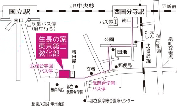 ・4番のバス停から「東芝・総合医療センター経由国立行き」または 「総合医療センター行き」バスに乗り(約10分間隔で運行)、「武蔵台学園」で下車。 「生長の家」の看板を目印にして徒歩1分。 |