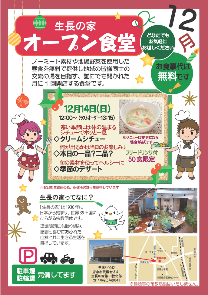お客様および運営委員数の合計人数は75名でした。初参加者は4人でした! 今月のメニューは、「ピラフ、スパニッシュオムレツ、春菊のくるみ味噌和え、春野菜スープ、ミルクティ寒天」でした!いろいろな方が春野菜を提供してくださり、実だくさんのスープとなりました。...