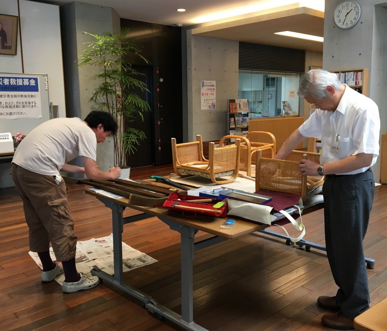 ・日 時:平成30年7月15日(日)子ども食堂の後 13:00~ ・会 場:教化部会館 玄関前ロビー 当会館大拝殿、和室の籐いすが壊れかけているので、修理をしました。 丈夫に出来上がりました。